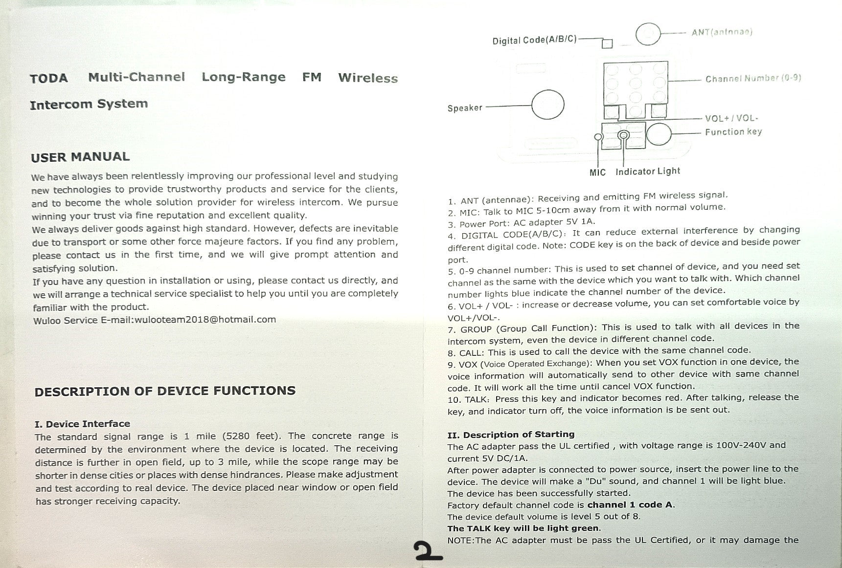 • Multi Channel and Long Range: This wireless intercom system has 0-9 channels; the distance up to 600m(1800ft) in the open area, built-in microphone and speaker, do not need to hold down it.