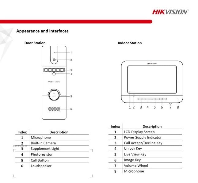 - Video Door Phone (VDP DS-KIS204 7-inch): A 7-inch video intercom system with a high-resolution display, allowing you to see and communicate with visitors at your doorstep. It also includes a camera with night vision, ensuring clear visibility even in low-light conditions.