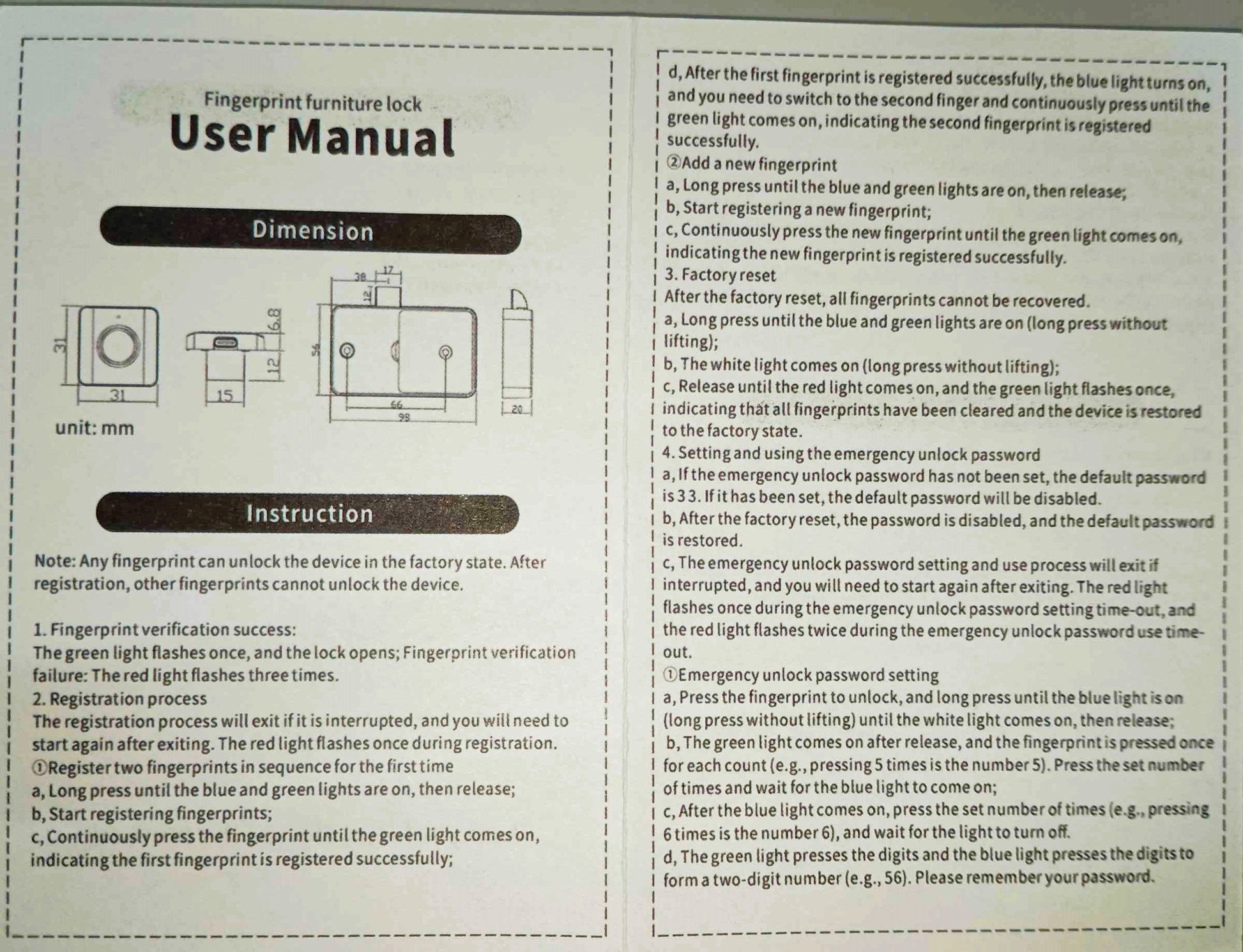 - Biometric Fingerprint Technology: The lock uses advanced biometric fingerprint recognition technology, providing a secure and convenient way to for unlock your drawer or cabinet. Assign Users: Store up to 20 fingerprints per lock.