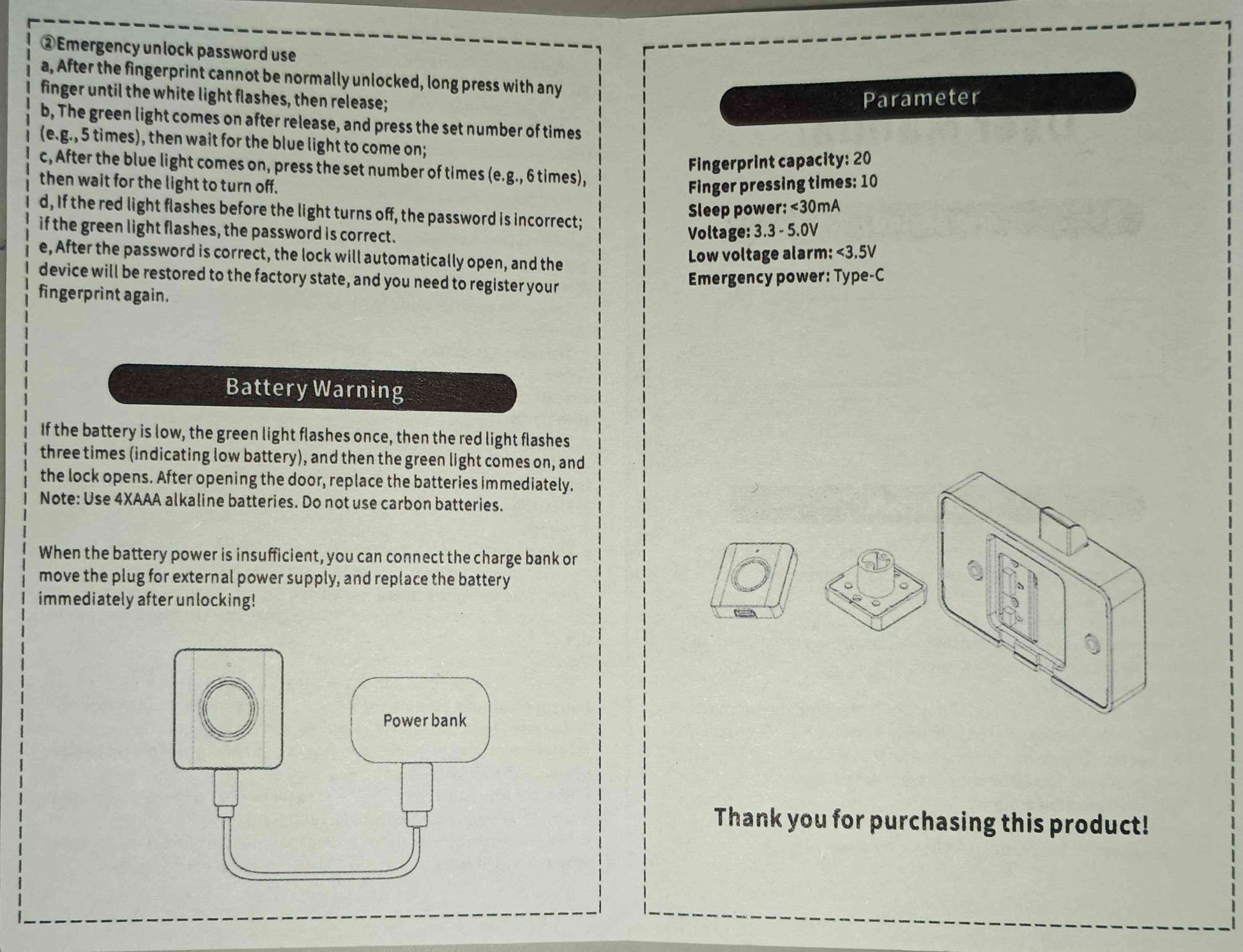 - Emergency Power: In case of battery drain you can get access to the lock by connecting a powerbank to emergency power port.
