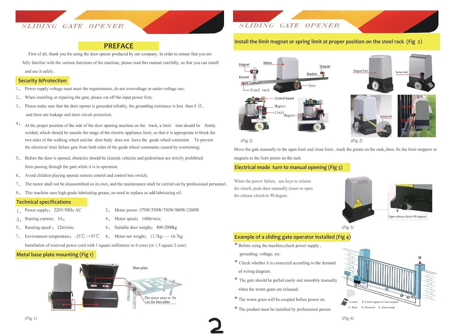 Navkar Systems Sliding Gate Motor is a reliable and efficient solution for automating sliding gates. Designed for convenience and security, this motor offers smooth and quiet operation while ensuring the safety of your property. With easy installation and user-friendly controls, it's suitable for residential and commercial applications. Enhance your gate's functionality with this robust motor that combines durability and modern automation features. Specifications Power supply: 220V AC 50Hz/110V 60Hz, Motor power: 370W, Motor rotational speed:1400r/min, Reduce ratio : 30:1