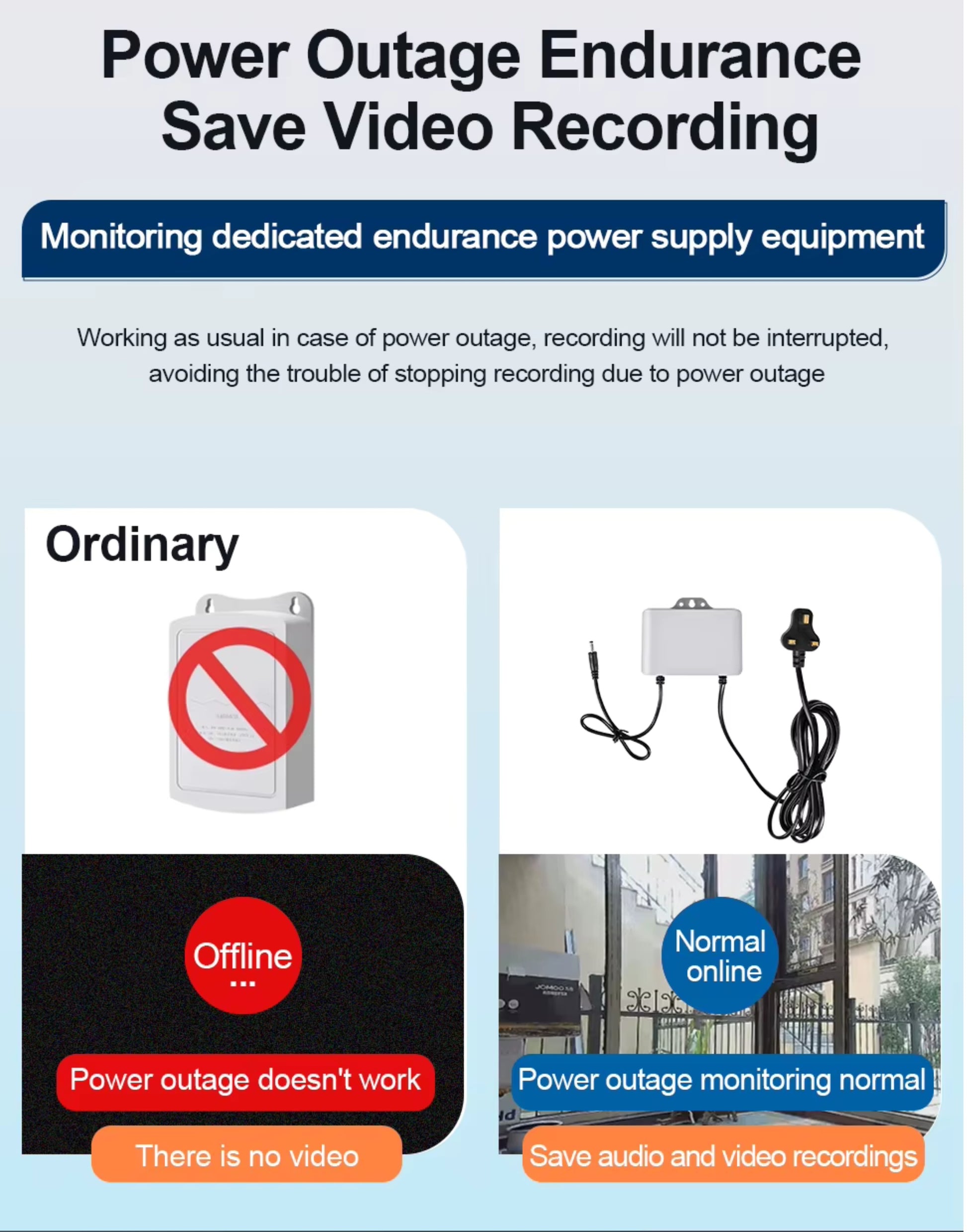 • Monitoring Dedicated endurance Power Supply Equipment: Working as usual in case of power outage, recording will not be interrupted, avoiding the trouble of stopping recording due to power outage
