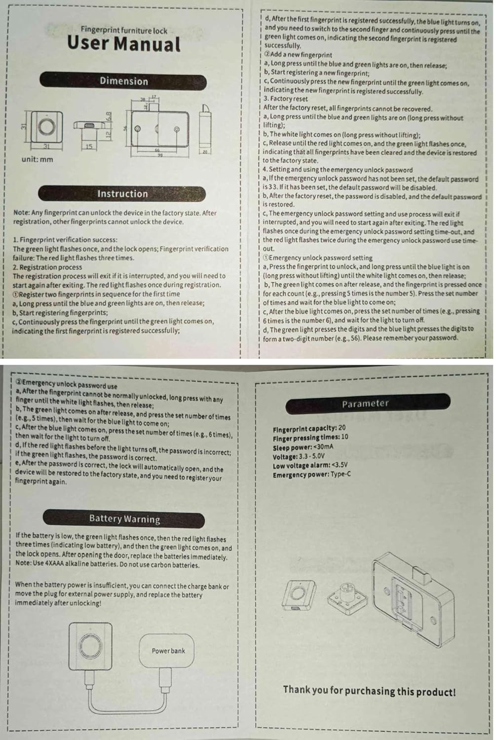| Included Components | 3 pcs of Fingerprint Drawer Lock |